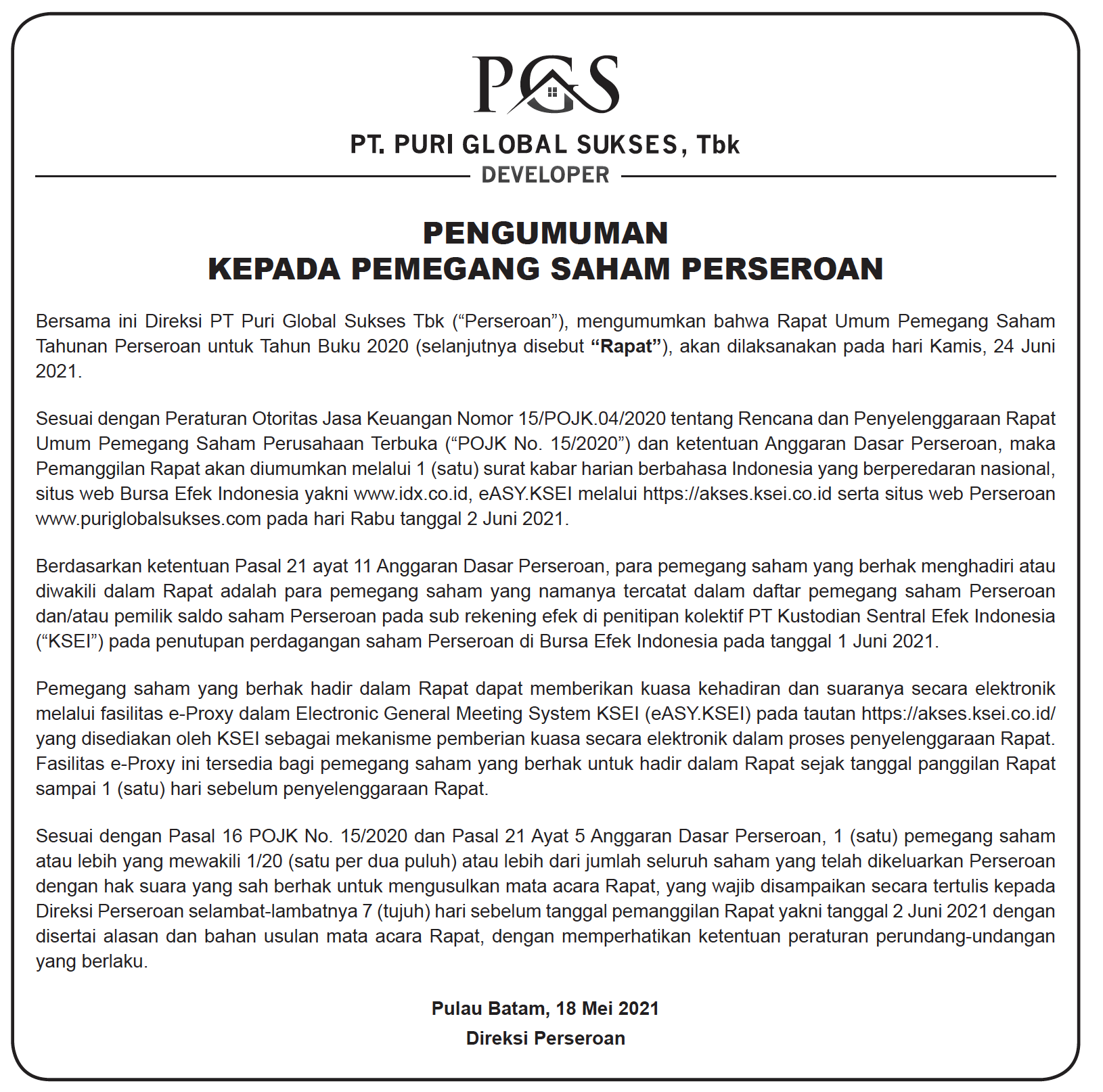 Pengumuman RUPS PT. Puri Global Sukses, Tbk